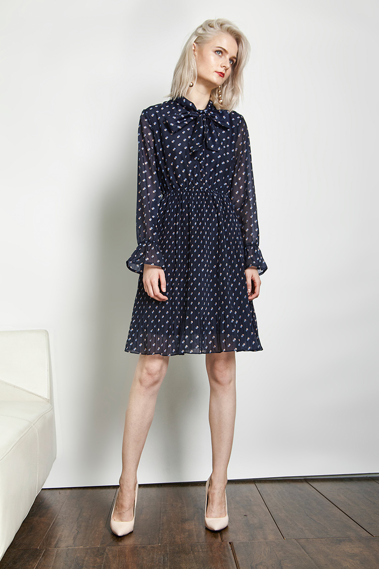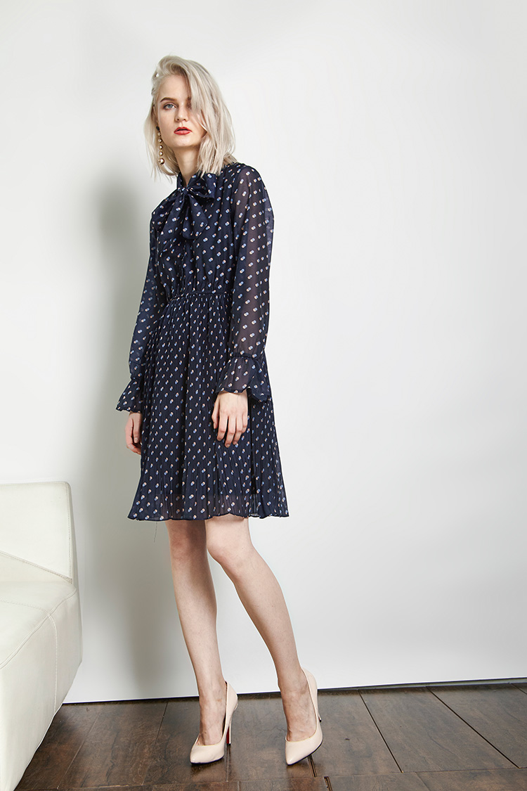 - 心形印花丝质飘带丝带喇叭袖连衣裙