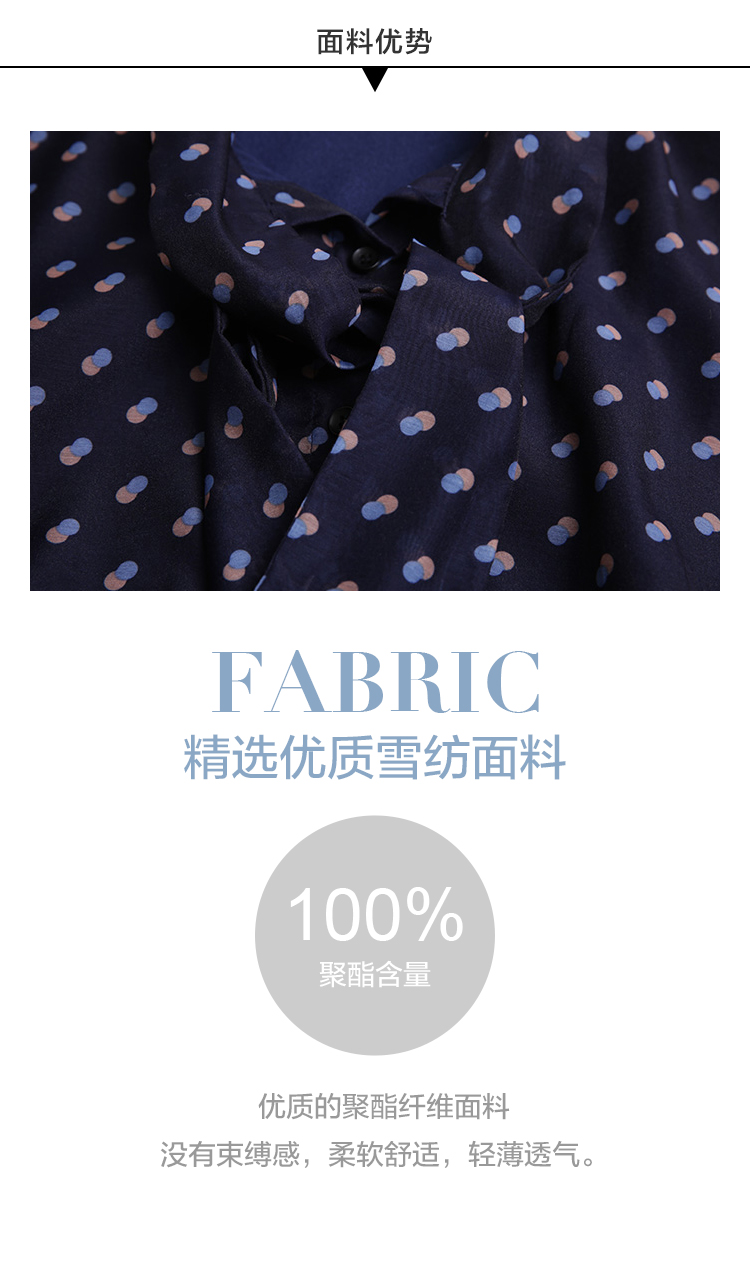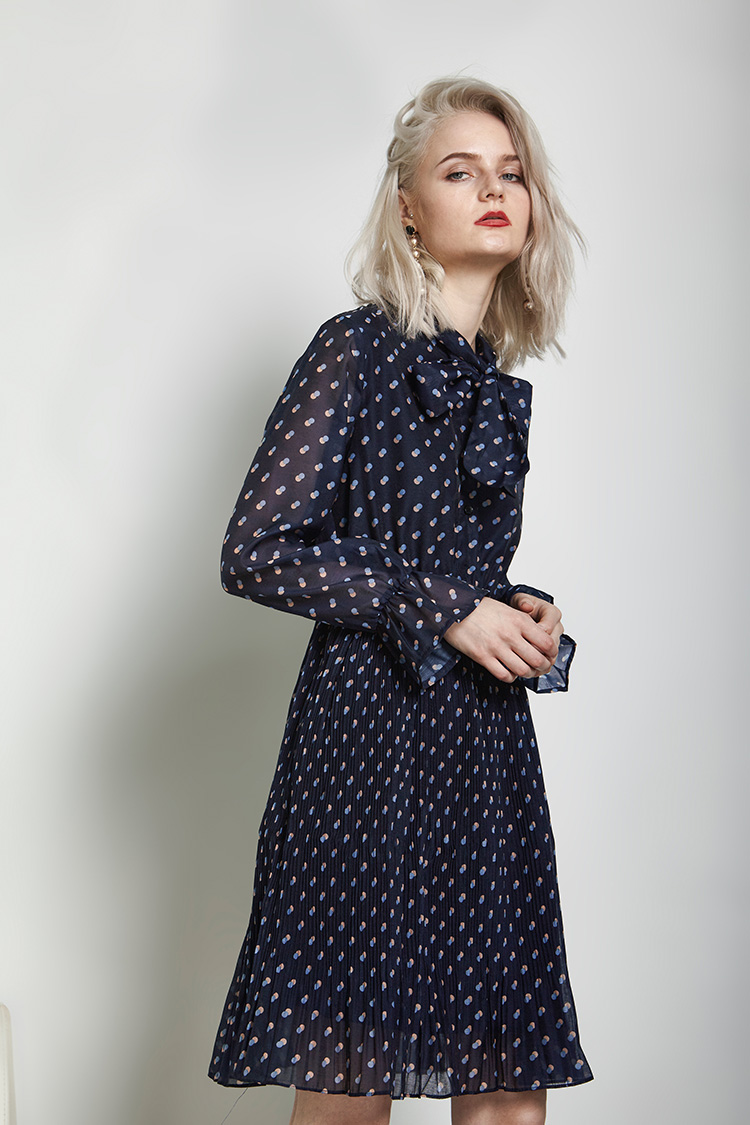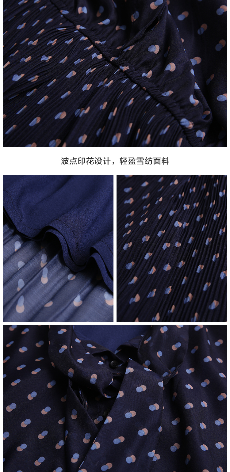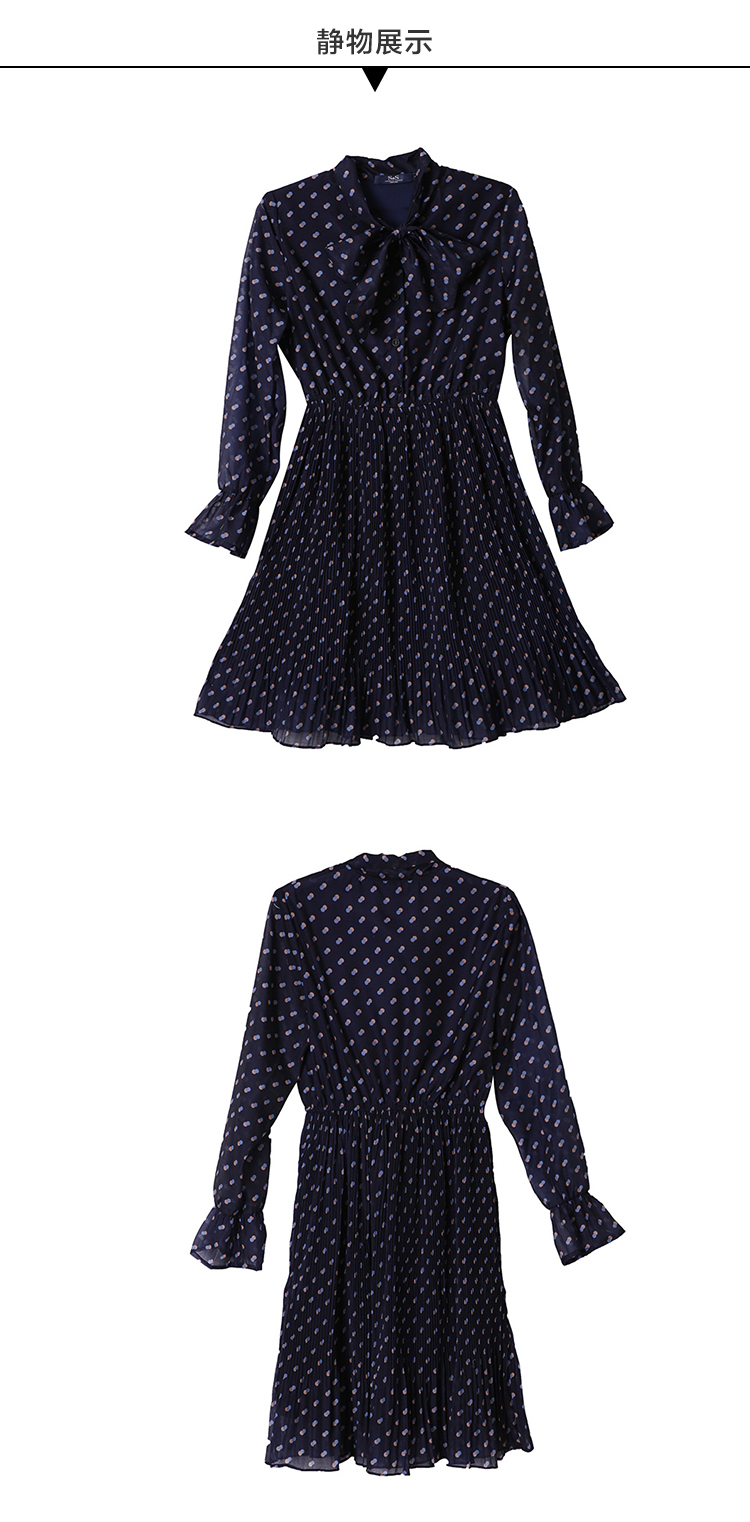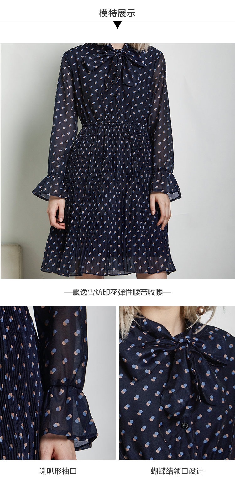 - 纽约故事 灰蓝色印花雪纺飘逸长袖连衣裙
