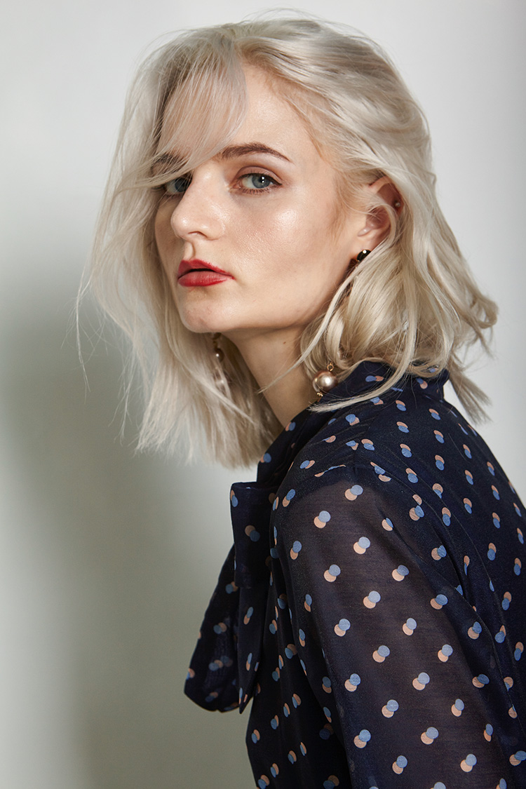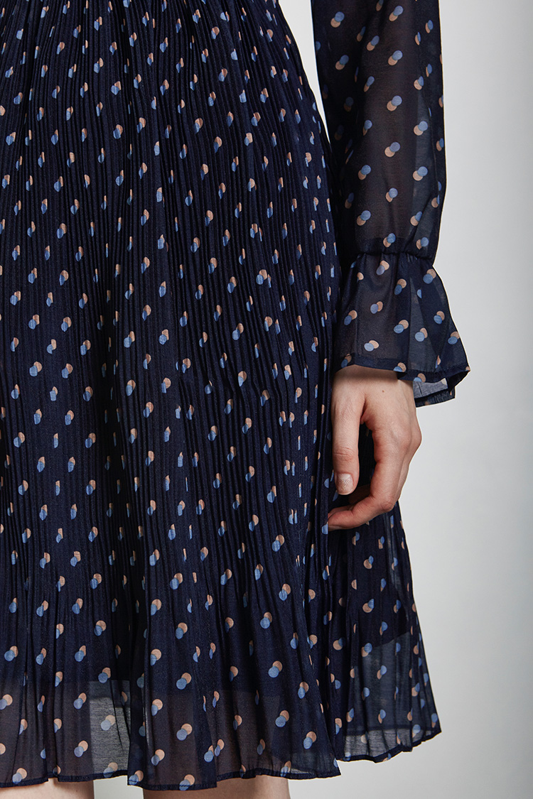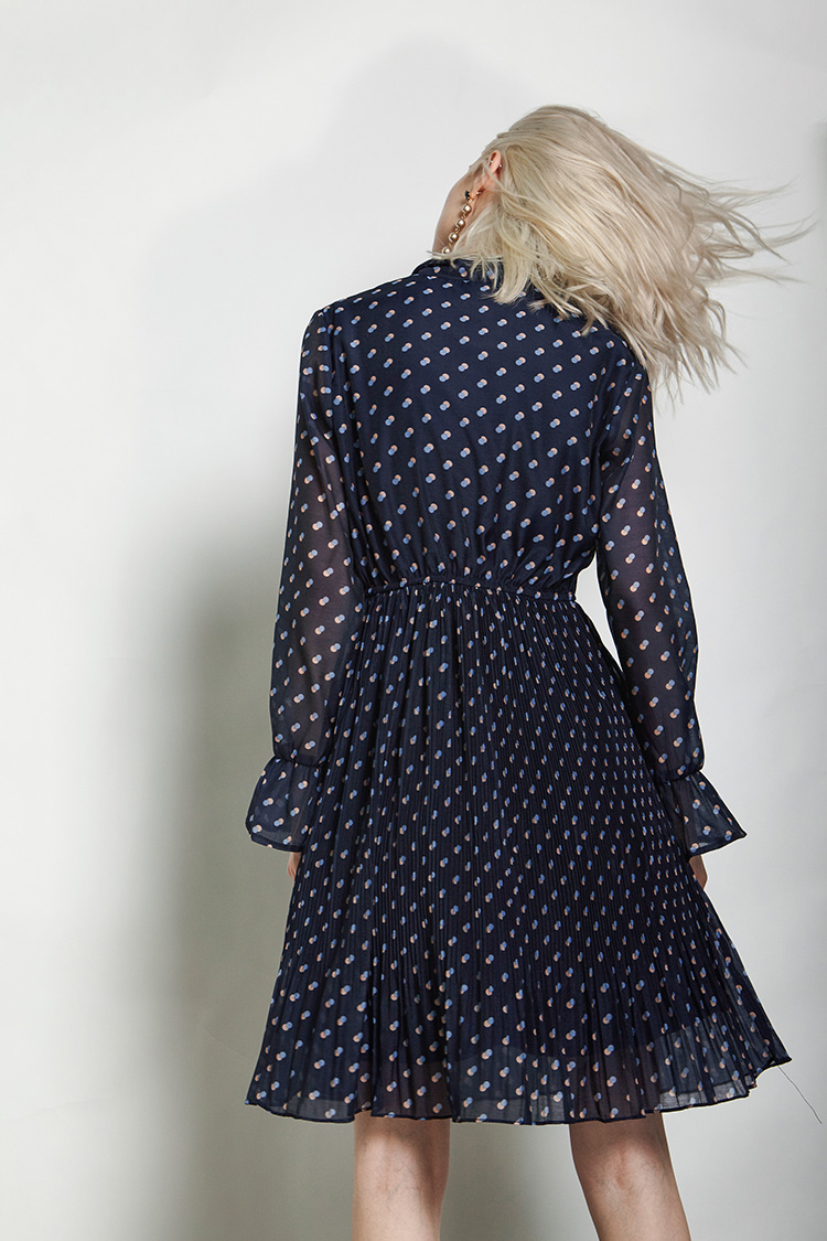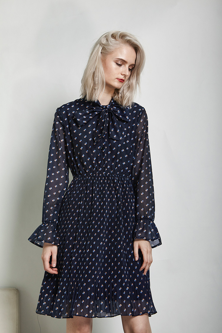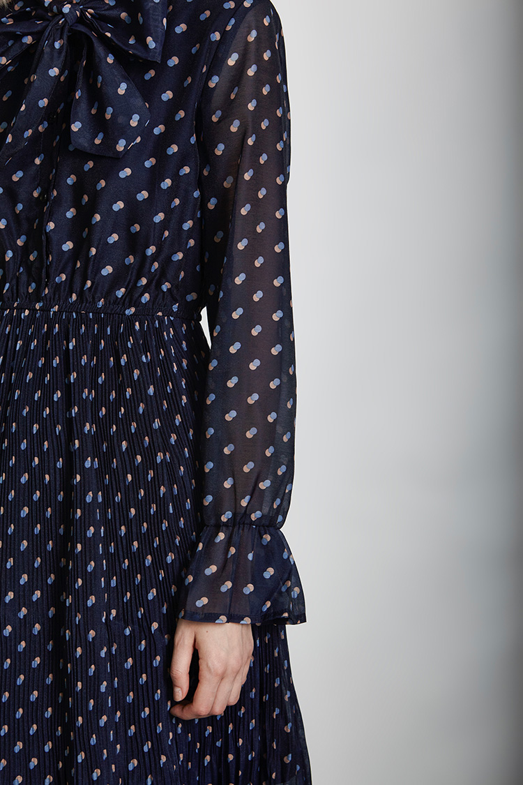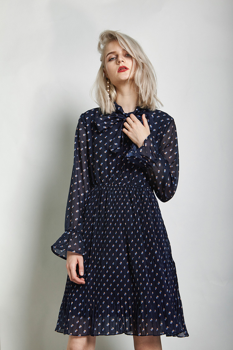 - 纽约故事 灰蓝色印花雪纺飘逸长袖连衣裙